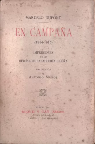 329 páginas. Traducción de Antonio Muñoz. “En las páginas que componen el presente libro no debe buscar el lector estudios tácticos, criticas de orden militar o relatos de batallas. Conservar el recuerdo escrito de algunas de las horas vividas de esta guerra fue mi único deseo al emprender el trabajo. Simple oficial de cazadores, no es tanta mi pretensión que me crea autorizado a juzgar las operaciones militares que, desde hace nueve meses, s» desarrollan en un frente inmenso. No hablaré, pues, sino de lo que he visto con mis propios ojos, en la insignificante parcela del campo de batalla en que se encontraba mi regimiento. Al escribir estas páginas me he dicho que, si escapaba sano y salvo de la formidable lucha, me complacería grandemente el encontrar en SM día mis relatos de combate o de vivaque. También pensé que los míos los leerían con gusto y por eso, entre dos cabalgadas, me esforcé en analizar las impresiones sentidas. Días de miseria, días de alegría, días de combates… ¡Cuántos y qué abultados volúmenes se ‘podrían escribir si se siguiera paso a paso a nuestros escuadrones en su marcha guerrera! Yo preferí escoger entre tantos recuerdos, pues no me propuse escribir unas memorias, sino solamente evocar los instantes más trágicos o los más conmovedores de los que viví en el curso de esta campaña. Y, ciertamente, no me faltó material. Si así puedo hacer revivir para mis camaradas algunos de los actos de la tragedia de la que fuimos actores, me consideraré muy venturoso. Si estas impresiones pueden interesar, además, a los que no han tomado parte en la guerra como combatientes, se las presento gitsioso. Mas que en ellas no busquen el talento de un gran escritor ni el interés de una novela, pues no podrán descubrir sino el llano relato de un testigo, el torpe ensayo literario de un soldado más habituado a manejar las armas que la pluma.” M.D. En el frente, mayo de 1915.