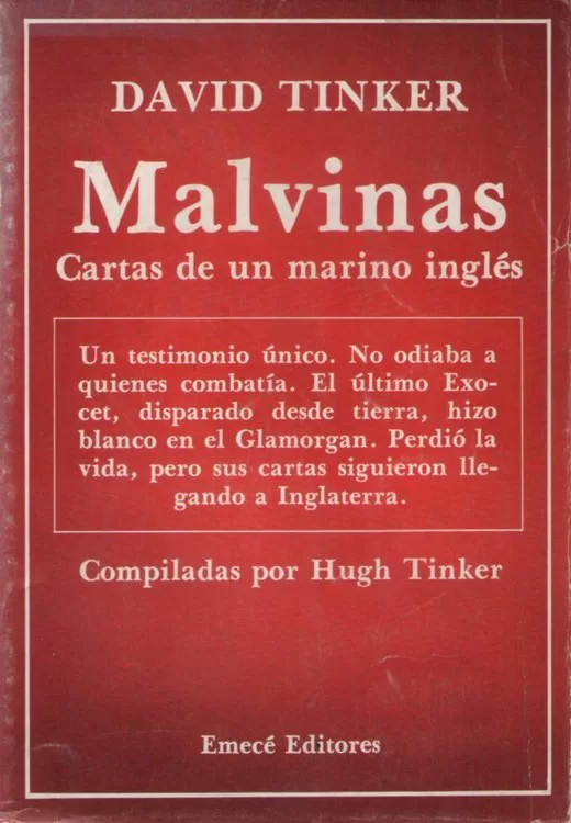 190 páginas. Primera edición. Título del original en inglés: “A message from the Falklands”. Traducción de Benigno H. Andrada. Un testimonio único. No odiaba a quienes combatía. El último Exocet, disparado desde tierra, hizo blanco en el Glamorgan. Perdió la vida, pero sus cartas siguieron llegando a Inglaterra. David Tinker era un joven marino inglés, de sólo veinticinco años de edad. Dueño de una cultura clásica, era profundamente inteligente y sensible. Escribía versos desde su infancia. Se encontraba a bordo del Glamorgan cuando fue enviado a combatir en las islas Malvinas. Desde allí escribió a su joven mujer, Christine, a sus padres y a sus amigos. Sus cartas contienen agudas reflexiones, expresadas con la sinceridad de la juventud. Como el poeta Yeats, no odiaba a quienes combatía. Antes bien, fue comprendiendo y reconociendo la injusticia de la guerra que se libraba “por un principio entre dos dictaduras”, según su severo juicio crítico. El 12 de junio el último Exocet, disparado desde tierra, hizo blanco en el Glamorgan. Tinker perdió la vida, pero sus cartas siguieron llegando a Inglaterra. Hugh Tinker, padre de David, ha recopilado con cariño las cartas de su hijo. Constituyen un patético mensaje, un testimonio único, abonado por la trágica muerte del autor. Sus reflexiones perdurarán tanto como el recuerdo mismo de la guerra.